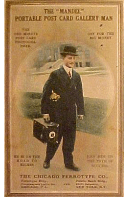 La Mandel Photo Postcard Machine, in produzione dal 1911 fino agli anni ’30, era un modello destinato ad operatori professionali da strada. Consentiva un ciclo più automatizzato, un taglio intelligente delle card da rotolo di carta ferrotipo, e un sistema di sviluppo e fissaggio interno. Era usata anche in sale giochi o fiere, con operatori che potevano scattare e consegnare una foto in meno di 90 secondi, clienti pagavano direttamente sulla postazione. I kit di rivendita includevano camera, ricariche di carta ferrotipo e monobath, ricambi meccanici e manuali operativi.