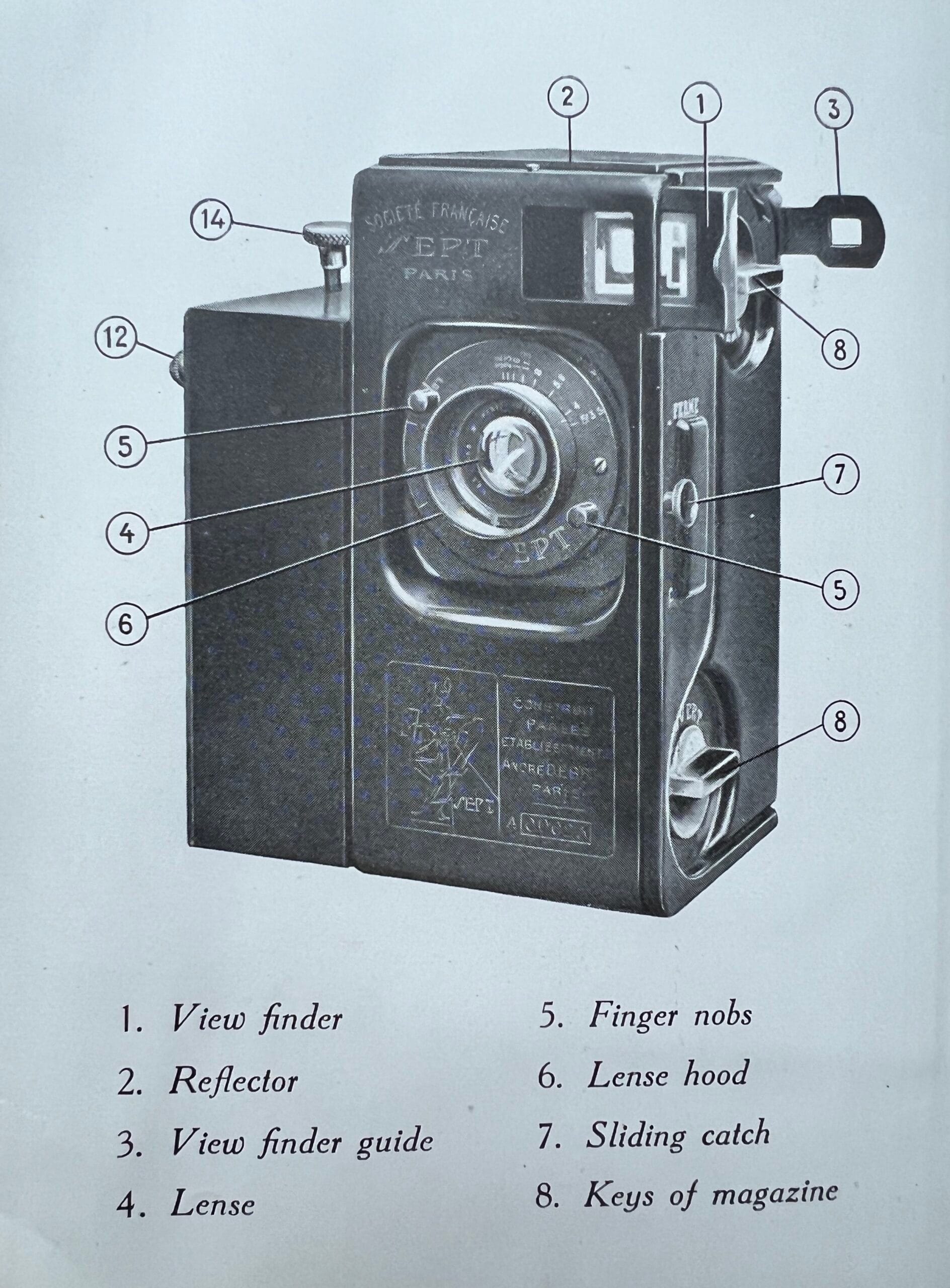 La parte cinematografica del dispositivo funzionava mediante un motore a molla caricato manualmente tramite una leva laterale. Questo meccanismo permetteva di girare circa 5-6 metri di pellicola 35mm per volta, equivalenti a circa 15-20 secondi di ripresa continua alla velocità standard di 16 fotogrammi al secondo, che era all’epoca il frame rate cinematografico più diffuso. La trascinazione della pellicola avveniva tramite un sistema a croce di Malta miniaturizzato, azionato dalla molla centrale e dotato di meccanismo di arresto automatico.