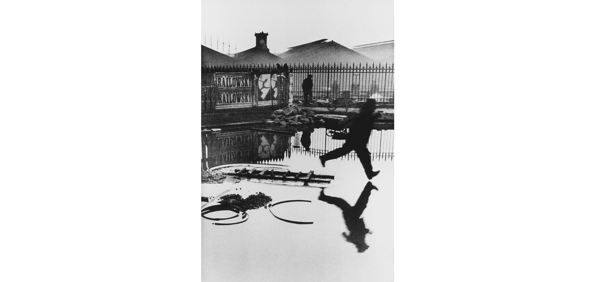 Il fotografo, nascosto dietro la rete, montava sulla sua Leica I (Model A) un obiettivo Elmar 50mm f/3.5 e caricava pellicola 35mm Kodak Panchromatic, in grado di restituire una gamma tonale molto ampia per l’epoca. Inquadrò senza portare l’occhio al mirino: Cartier-Bresson stesso raccontò di aver scattato “a istinto”, basandosi sulla propria conoscenza delle proporzioni e delle distanze. L’uomo che vediamo saltare — forse un operaio o un passante — stava cercando di evitare l’acqua stagnante. In quell’attimo, la figura umana, il riflesso e le linee delle impalcature si allinearono perfettamente: un equilibrio geometrico momentaneo tra tempo e spazio.