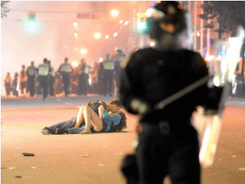 Scott Jones e Alexandra Thomas erano stati buttati a terra dai scudi antisommossa della polizia mentre cercavano di raggiungere casa da casa di un’amica, dove avevano guardato la partita. Thomas era spaventata e in stato di shock; Jones, vedendola in quello stato, le si avvicinò e la baciò per consolarla, nel tentativo di portarle un attimo di calma nel mezzo del caos. Non stavano performando per nessuno; non erano consapevoli della presenza del fotografo. Lam, che li vide da una certa distanza, capì immediatamente il valore visivo della scena: “Questa è la storia”, ha detto di aver pensato in quel momento, aggiungendo che aveva inquadrato consciamente per includere uno degli agenti antisommossa sullo sfondo, convinto che quella combinazione, una coppia che si abbraccia e un poliziotto corazzato, avrebbe prodotto l’immagine più narrativamente completa della serata. Scattò in totale dodici fotogrammi della coppia, in rapida successione; di questi, sei furono scartati in post-produzione e sei vennero trasmessi via filo agli editor di Getty. Non fu Lam a selezionare il fotogramma pubblicato: fu un editor Getty, il cui nome non è mai stato reso pubblico, a scegliere tra i sei trasmessi quello che sarebbe diventato la fotografia iconica.
