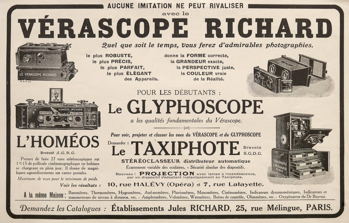 Il contesto storico in cui operò Richard fu cruciale: la seconda metà dell’Ottocento vide la transizione dalla fotografia su lastra al collodio umido verso formati più pratici, come le pellicole flessibili. Richard riconobbe l’importanza della stereoscopia, una tecnica che permetteva di creare immagini tridimensionali utilizzando due fotografie leggermente sfalsate. Nel 1893, brevettò il Verascope, il primo stereo camera commerciale progettato per utilizzare pellicola a rullo, sostituendo le ingombranti lastre di vetro. Questo dispositivo, compatto e robusto, utilizzava un sistema a doppio obiettivo con basculaggio parallelo, garantendo un perfetto allineamento delle immagini per l’effetto 3D.