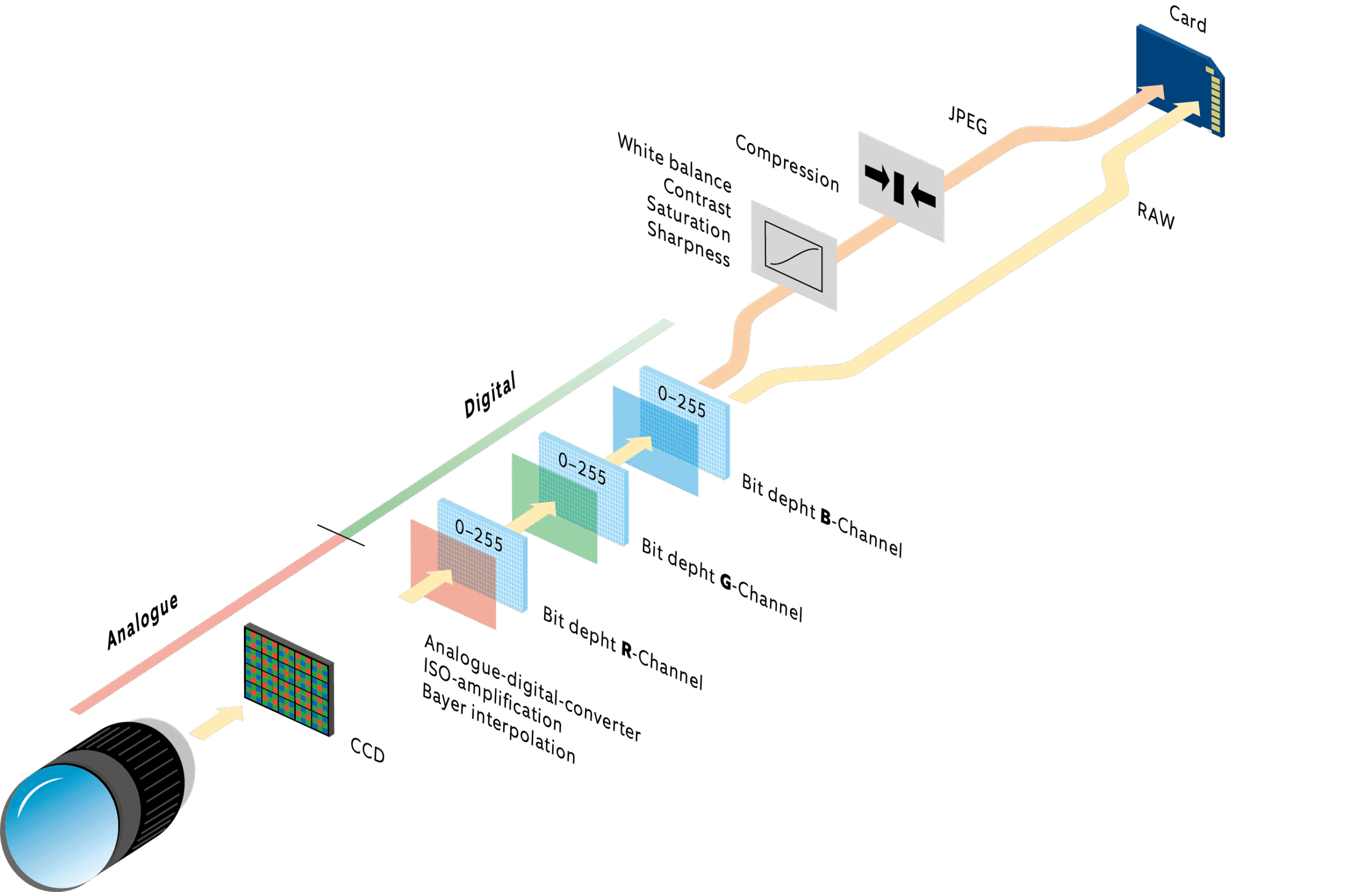 Quando il fotografo preme il pulsante di scatto, il processo di acquisizione RAW ha inizio: la luce attraversa l’obiettivo, filtri antiriflesso e ottiche di correzione, quindi colpisce il sensore, che può essere di tipo CCD o CMOS. Nel caso dei sensori CMOS moderni si utilizzano tecnologie come il dual gain architecture (ad esempio nei sensori Sony Exmor) o il Quad Bayer, in grado di ottimizzare il segnale elettrico prima della conversione A/D.