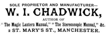 nome W. I. Chadwick compare nella storia della fotografia britannica tra fine Ottocento e inizio Novecento come costruttore semi‑artigianale di macchine fotografiche e ottiche di precisione. Stabilitosi a Manchester, Chadwick operava in un contesto urbano densamente occupato da produttori e distributori fotografici, proponendosi come specialista nell’offrire apparecchi su misura per uso stereografico o paesaggistico. La sede storica era nella zona di St Mary’s Street (Deansgate), a Manchester, dove Chadwick attivò la sua bottega specialistica a partire dagli anni Ottanta dell’Ottocento, dopo aver acquisito esperienza come tecnico di precisione nel settore ottico.